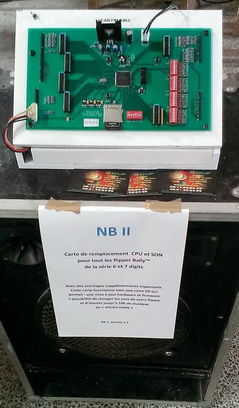 Petit moment ensuite pour saluer les habitués de la plupart des salons, à l'instar de Fred, Didier, Fabrice. C'est à ce moment que le "Doc" m'a confié que son fils avait terminé son projet d'une carte de remplacement de la CPU Bally (première génération). Surpris et intéressé, je le presse de me donner des renseignements sur la disponibilité. Il me renvoie vers Stéphane (alias Spinck de Steflip) pour les détails. Cela fait des années que Didier me parle de ce projet formidable: réaliser une carte de remplacement pour les Bally. Il me semble qu'à l'origine, il s'agissait de réaliser une carte "toute en un" à l'instar de la "PI-1-X4" pour les System 1. La version réalisée est finalement une carte de remplacement de la carte son et de la CPU. La version présentée sur le stand de Stéphane est une version finalisée, mais non définitive. Il reste des petits détails comme par exemple la présence d'un potentiomètre avec un bouton rotatif (et non une simple vis), une LED pour le 5V, un fusible réarmable, et potentiellement d'autres détails pour rendre plus opérationnelle encore cette carte, le but étant de la rendre résistante vis à vis des erreurs que nos machines anciennes pourrait lui faire subir.